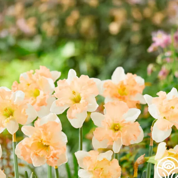 Note: Bulbs ship starting in October based on availability and your zone, unlike other products. Plant around or after your first frost but before the ground freezes. Apple Pie offers warm, inviting tones with soft yellow petals and a ruffled apricot-pink cup. The layered blooms have a full, textured look that adds charm to spring gardens and bouquets. Blooms mid-spring on sturdy stems and returns reliably each year with strong deer resistance. Expect her to reach 12-18”.