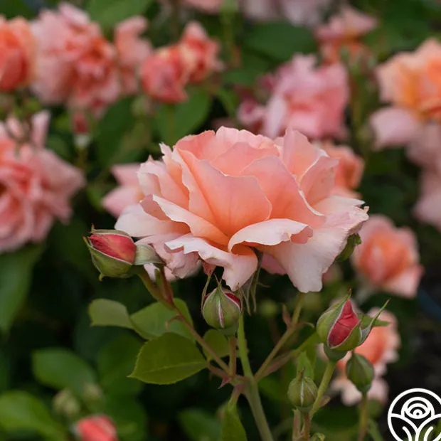 Apricot Candy™ is a delight to any garden palette with her ruffle-edged petals and rich apricot to pink coloring. While she looks delicate, this rose surprises with a moderately spicy fragrance! The upright, bushy growth habit supports the soft green foliage and pastel blooms. We love that this bush stays narrow at just 2-3’ wide but will shoot up to 5-6’ in height. Apricot Candy™ prefers the sunniest spot in your garden and will thank you with many flushes of blooms throughout the season.