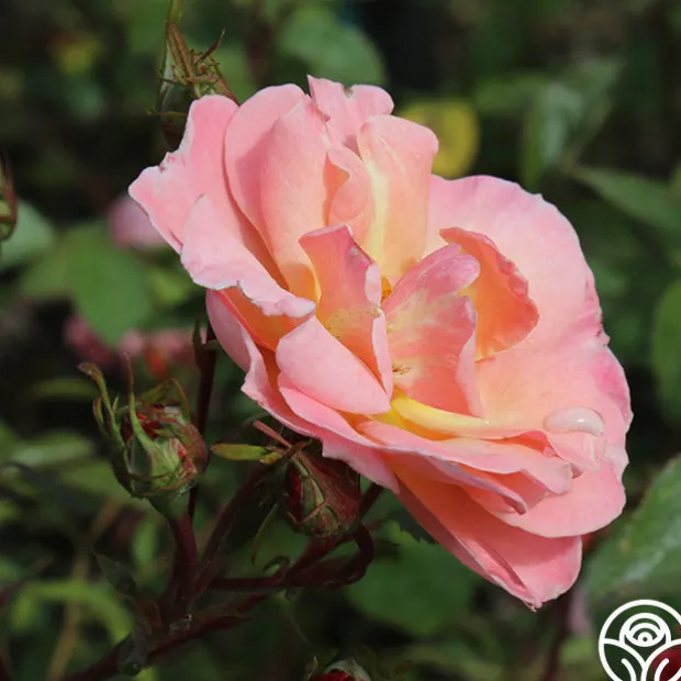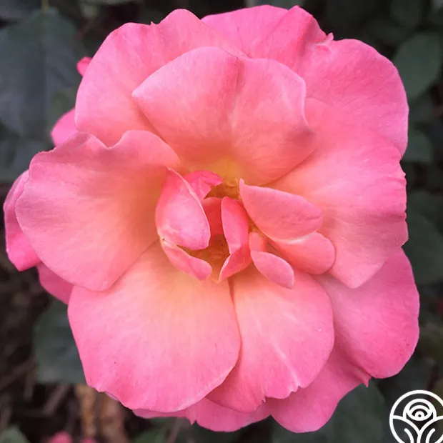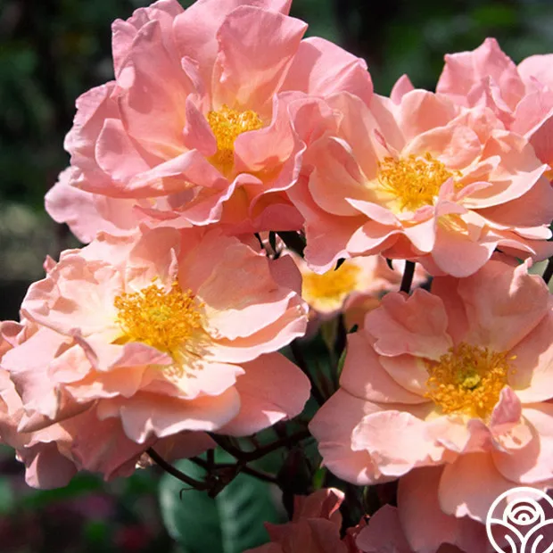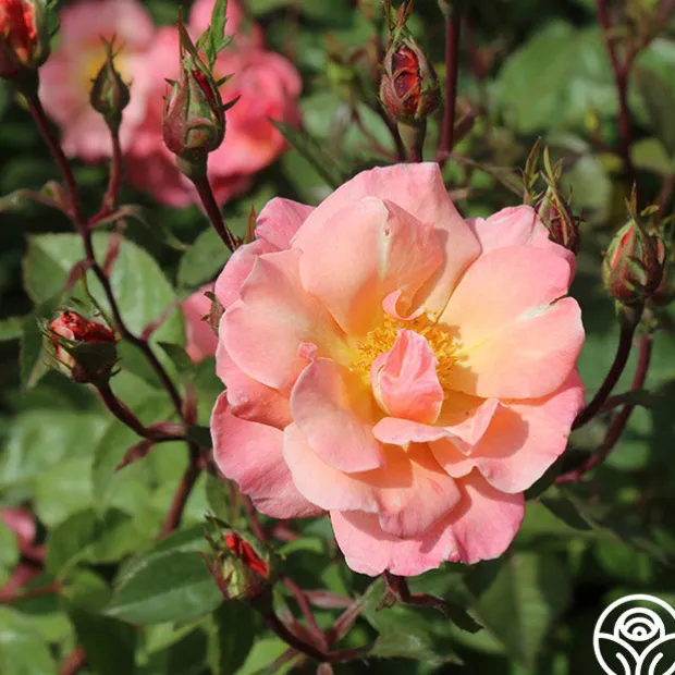 Dancing in the Wind™ produces an abundance of flowers in huge clusters of soft, salmon-pink, 2 ½” semi-double blooms with 12-15 petals. Her peachy-cream centers are contrasted by rich golden stamens on this upright, continual blooming, vigorous bush with glossy foliage. Dancing In The Wind™ is a romantic favorite suited for zones 5-10. Plant her in beds or pots as she thrives in both.