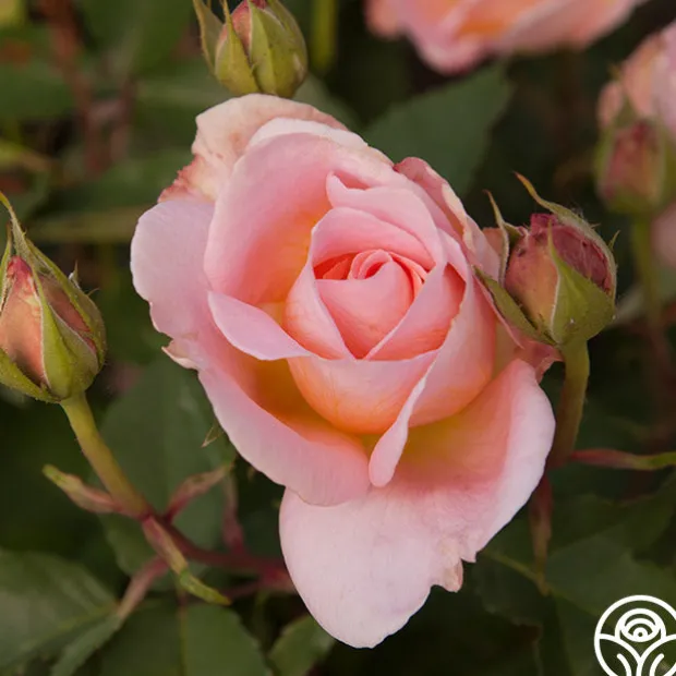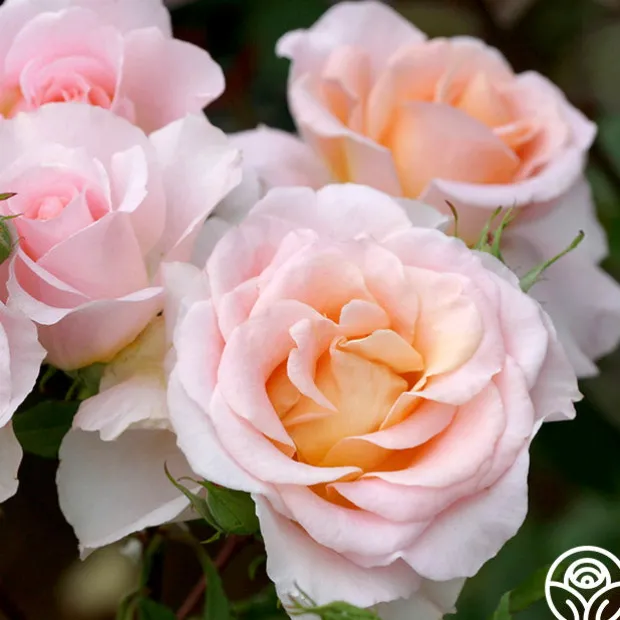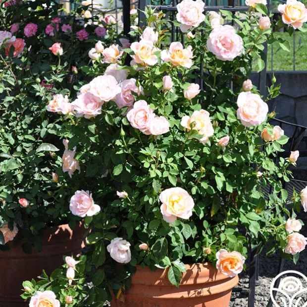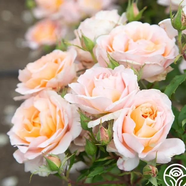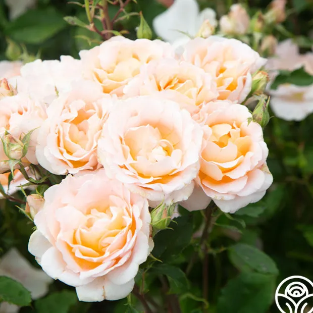 Desirée™ blooms in absolute abundance. Her classically formed 4” blooms have 20+ petals and are borne in clusters of rich, peach with highlights at the centers. Her blossoms shade to a delicate peach-pink toward the outer edges of the petals. Desirée™ exudes a strong, irresistible fragrance of fruity myrrh. She is a compact, very bushy plant with mid-green leaves with red, serrated edges.