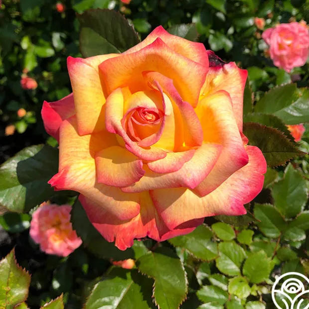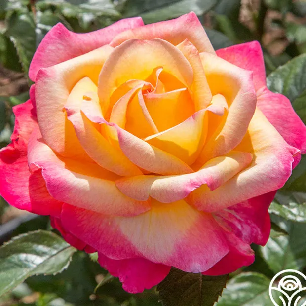 It’s easy to become enchanted with this beautifully colored, classically shaped Hybrid Tea. Enchanted Peace™’s buds open to a yellow/orange blend with orange along the edges of the petals. As the flower ages, she quickly changes to more yellow edged by brilliant pink. It’s like having two roses in one! This bushy, upright plant has very glossy, green foliage and will produce an abundance of very fragrant blooms throughout the season. Happy to grow anywhere, she performs as well in containers as she does in the garden.