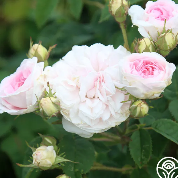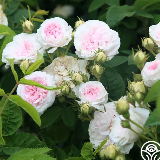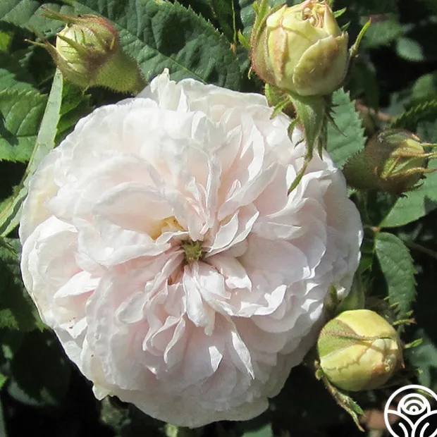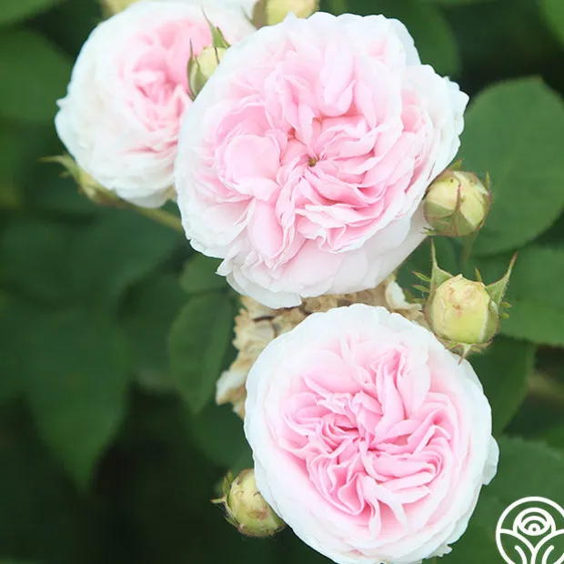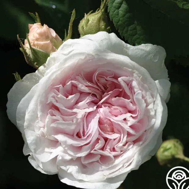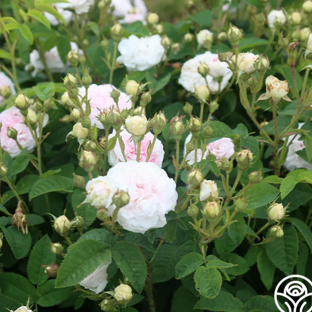 Exceedingly fragrant, beautiful, fully double blooms of a soft pink fading to white, on a compact, bushy once blooming plant with grey-green foliage.