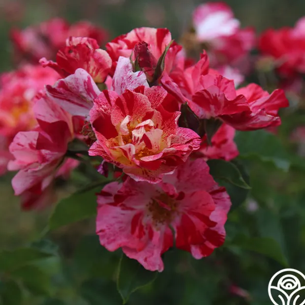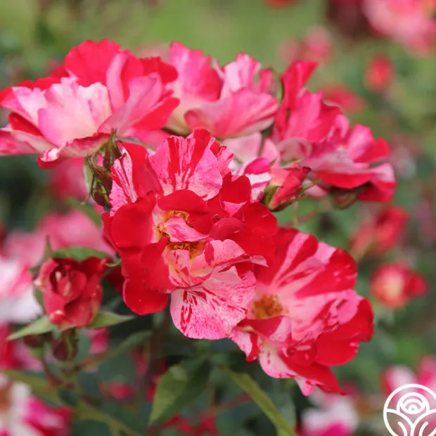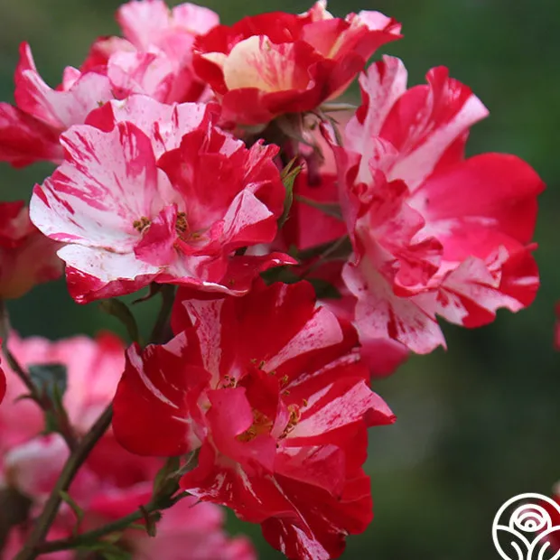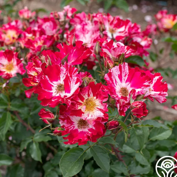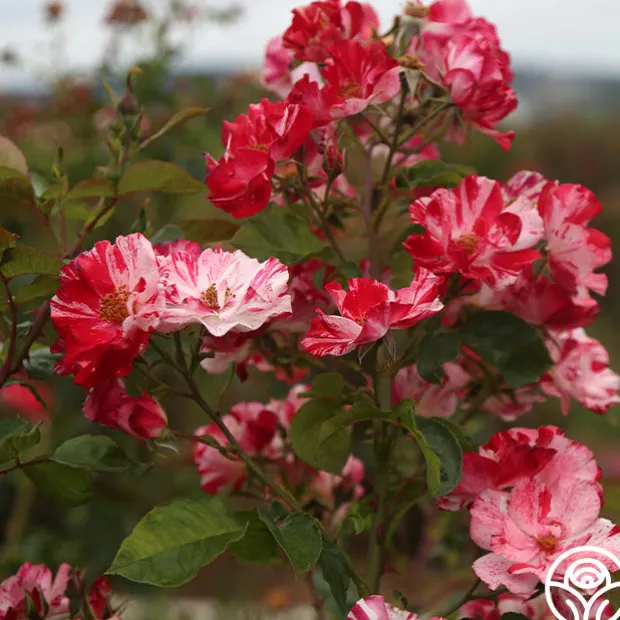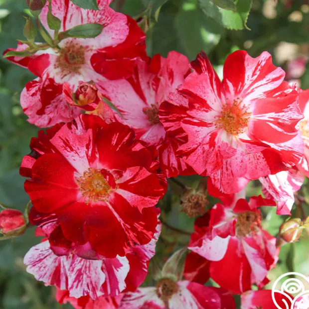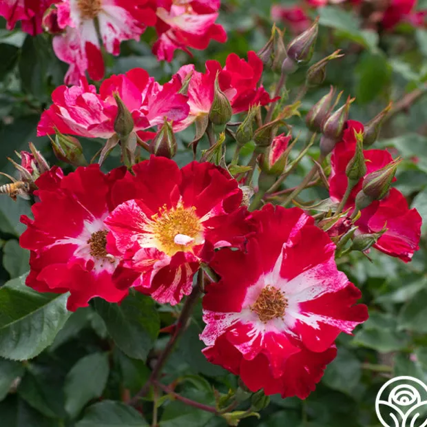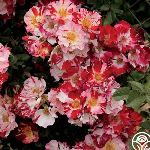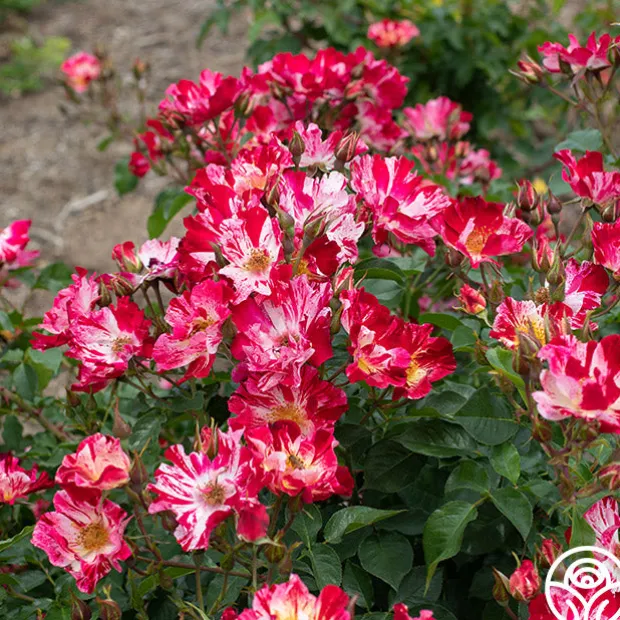 This patriotic rose is a stunner with her striped velvet-red and white, 4” blooms. We love the long-lasting blooms produced in large sprays and her spicy/sweet apple fragrance. Fourth Of July™ is a vigorously growing, disease-resistant, continually blooming plant with deep-green foliage. Fourth Of July™ is a Climber that will reach heights of 8-10’, but she may also be grown as a Shrub rose in cooler climates.