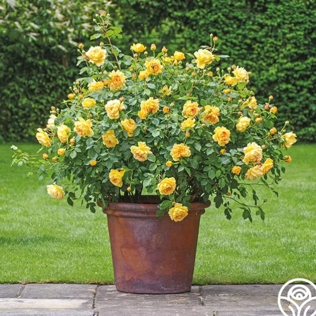 Golden Celebration® is a top seller with her large, deeply cupped, 3” flowers with up to 75 petals per bloom. Her color is unusually deep and rich golden-yellow with an exceptional fragrance of sweet wine and strawberries. Just delicious! Her blooms are set against dark, glossy green foliage on this repeat bloomer. We love her as a hedge, in a bed, or in pots.