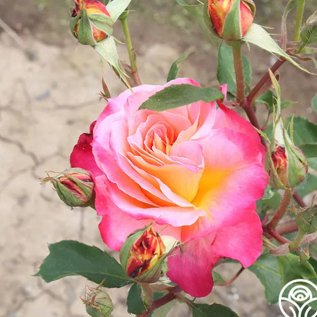 The most fragrant of the multi-colored roses, Granada produces urn-shaped buds which open into classic, large, very double blooms of about 4-5”. The treat of Granada is that the color varies greatly by temperature and zone. In a temperate zone the color is a combination of rose-pink and lemon-yellow blended with red, gold, peach, and apricot. Continual blooming, Granada exudes a strong, spiced scent, and makes an excellent cut flower.