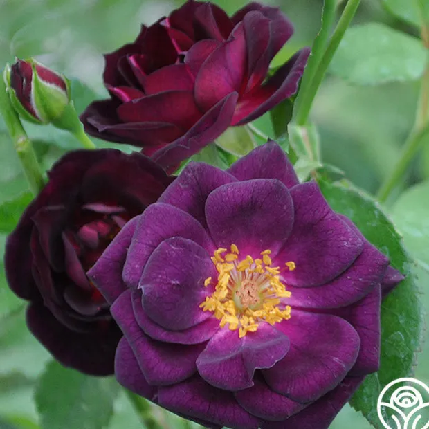 Midnight Blue™ is a nearly black, velvet purple 2 ½” rose with 25+ petals and a spice clove fragrance, like no other rose on the market. Despite being a Shrub, this compact rounded plant will lend itself to smaller spaces and enrich any landscape. Expect bright, green leaves that contrast nicely to the mysteriously colored flowers with showy, yellow stamens. Big clusters of blossoms will result in lots of color on this very popular continually blooming rose bush.