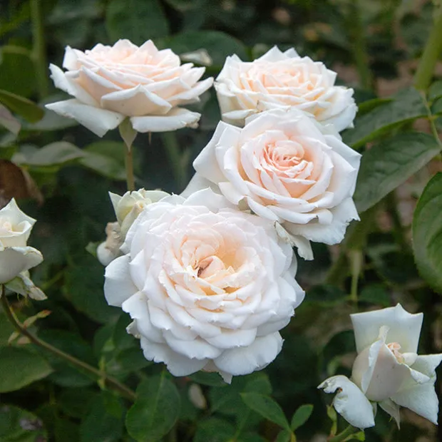 One of the most beautiful of all white roses, Prairie Star™ features showy ivory-white flowers with shell pink centers and a slight fragrance of lemons that bloom from late spring to fall. Her wonderful high-centered, fully double 4” blooms with 50-60 petals grow on an upright, continual blooming bush well clothed with luxuriant dark-green leathery foliage. She is winter hardy in the midwest without protection.