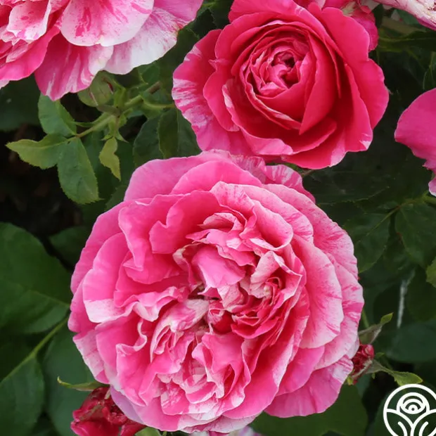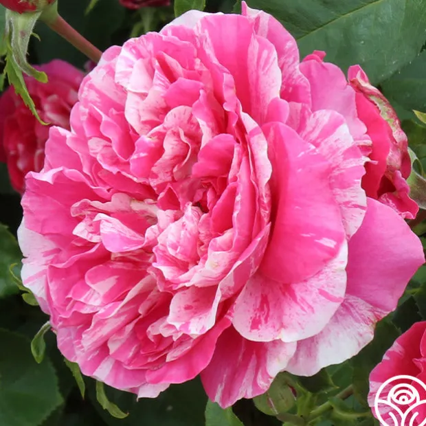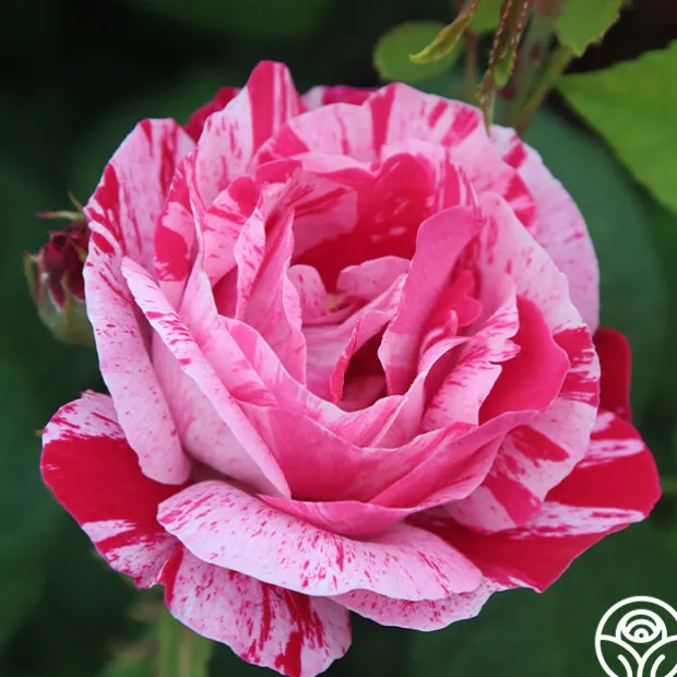 Raspberry Cream Twirl™ lives up to her name with deep pink petals striped with white and purple streaks. She is the first striped Climber with classic, exhibition-type blooms. Her large, very full, cuplike blooms emit a light apple fragrance. Raspberry Cream Twirl™ is a vigorously growing rose and will top out around 10-12’ tall and 4-5’ wide. She makes an excellent cutting rose and is nearly thornless too, making her perfect for high traffic areas or to climb pillars.
