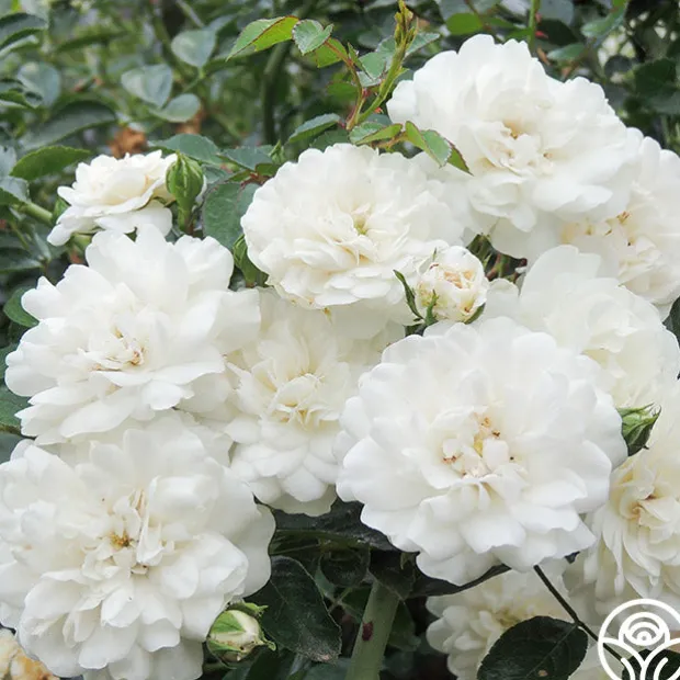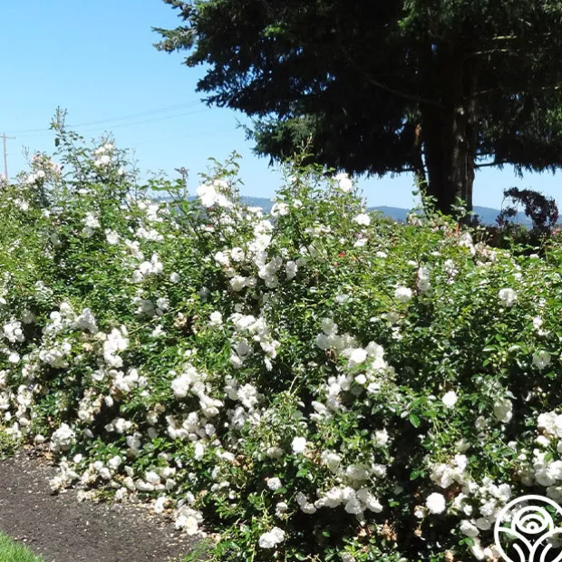 The first and still one of the finest Landscape Roses, Seafoam covers itself with clusters of eye-catching, creamy-white, double, 2 ½” blooms with 15+ petals. Set against glossy, dark-green foliage, the blossoms on this vigorous, continually blooming, trailing rose explode into masses of color. Expect her to be covered in blooms without pause all season long.