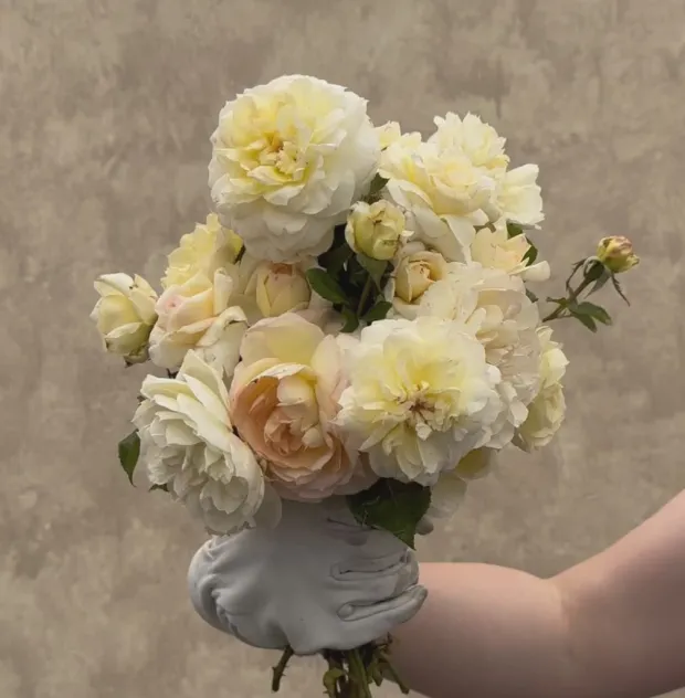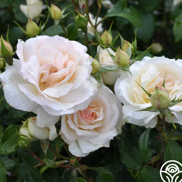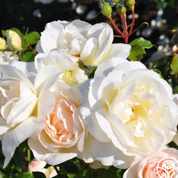 A rose named after the Russian composer, Tchaikovsky®, this plant produces large, very full, old-fashioned, 4” rosette blooms in clusters. His creamy white flowers have a buttery yellow center which look beautiful against the dense medium, semi-glossy, dark green foliage. He is a vigorous and bushy plant that blooms continuously and offers excellent disease resistance.