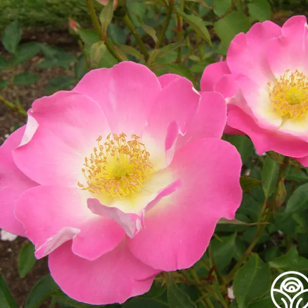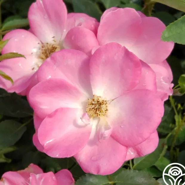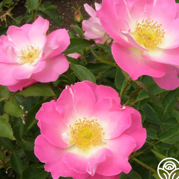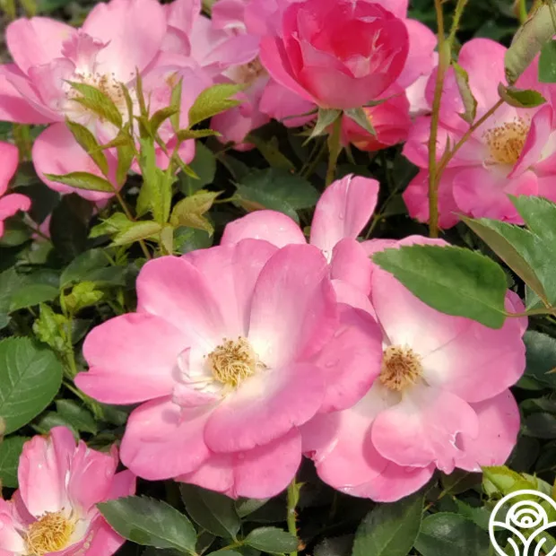 Angelina features 3-inch rose-pink blooms with a white eye and reverse. Her flowers appear in clusters of moderately fragrant roses set against light, matte green foliage on a bushy plant.