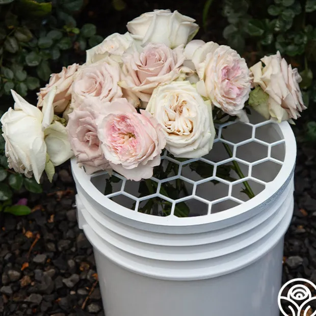 Keep your blooms upright and safe as you cut flowers in the garden. Adding the BloomShield™ to the top of a bucket* will make creating your own bouquets a breeze! The 2” honeycomb design is wide enough to hold multiple stems without getting tangled or caught on thorns. This bucket topper fits most 3.5 or 5 gallon-sized buckets with an outer lip no larger than 11.85” in diameter and an inner lip no smaller than 11.15” in diameter. The BloomShield™ bucket topper should be hand washed only and may warp if exposed to extreme temperatures.