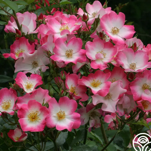 Named for a city in Congo, this deep pink Hybrid Musk Rose with arching canes blooms well throughout the season, producing 2” flowers with white centers. Bakuva has a low petal count of just 4-11 petals per blossom but produces blooms in large clusters with a moderate fragrance.