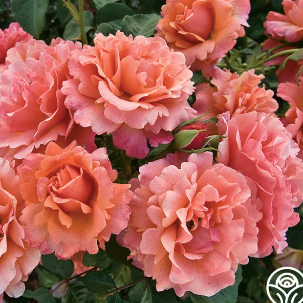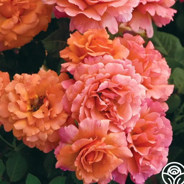 CUSTOMER FAVORITE! Easy Does It™ is an extremely free-flowering rose with 3 ½” blooms in swirling shades of mango-orange, peach-pink and honey-apricot. Her blooms are ruffled and classically spiraled with 26-40 petals and have a slight fragrance. She produces her roses on a bush with glossy, green leaves. Truly a workhorse for zones 5-10.