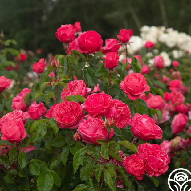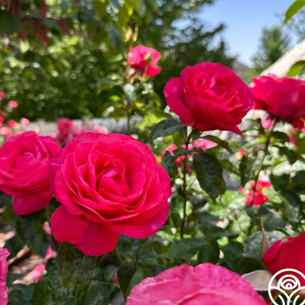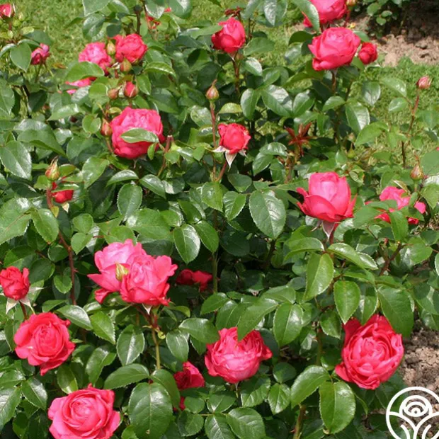 This Hybrid Tea is very resistant to diseases, including blackspot and mildew. The very large, very double, deep pink to cherry-red flowers grow in small clusters. While Eleganza® Fiji’s roses are lightly fragrant, she is a prolific producer. Lightly glossy, medium to dark green foliage fill in the few small gaps left by the clusters of blooms. Eleganza® Fiji is a more compact rose reaching about 4’ tall and 3’ wide which makes it perfect for planting in front of other plants or in a pot.