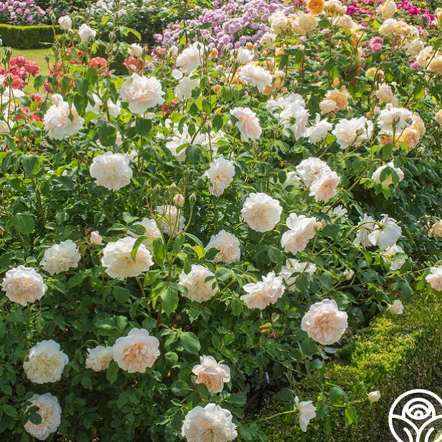 A top seller and much loved David Austin rose! The charming, peach pink cups of Lichfield Angel open to tidy, creamy apricot rosettes that emit a light, clove fragrance. With up to 110 petals on each bloom, this continually blooming rose provides large, 4”, domed, creamy-white flowers that pop against her semi-glossy, dark green foliage. Lichfield Angel is a shapely shrub, growing to be 4’ wide and 4’ tall. We love her in a cutting garden, in pots, or as a hedge as she fills out quite nicely.