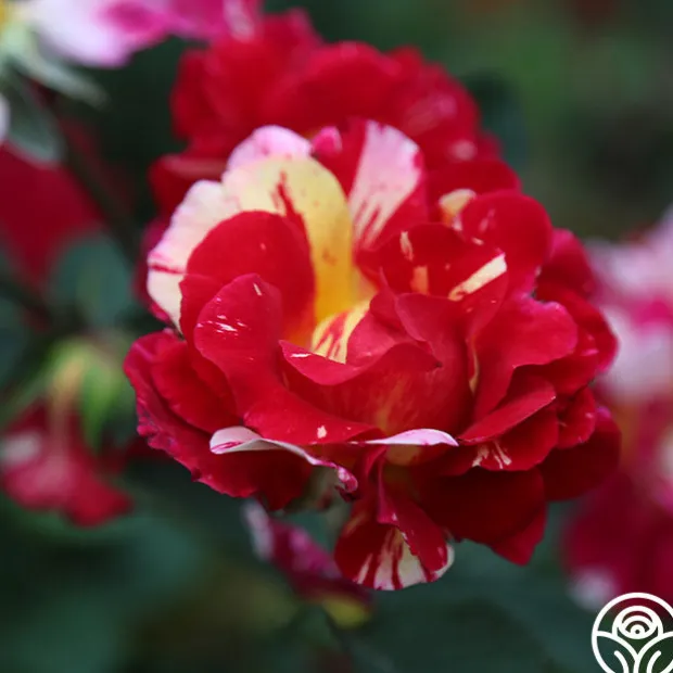 Named for the French painter, Maurice Utrillo® is an easy to grow rose with petals painted in splattered red, white, and yellow stripes. This Hybrid Tea produces 3-4″, cupped blooms. He is disease resistant and makes a great gift for new rose gardeners as it is easy to care for, blooms in flushes throughout the season, and boasts a lovely moderate fragrance.