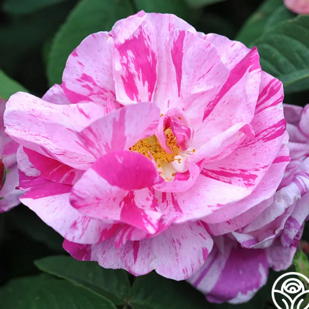 One of the most famous of all of the Old Garden Roses, Rosa Mundi has many stunning characteristics that have made her a favorite of gardeners worldwide since the 1500s. This once-blooming plant produces striking, semi-double, 3-4” flowers with 12-18 petals of crimson background splashed and striped with white and pink and is accentuated by bright golden stamens. She is nearly thornless, compact, produces beautiful hips in the fall which draw the birds, is very fragrant, and is also shade tolerant. Rosa Mundi has so much to offer! We strongly recommend her for zones 4-8.