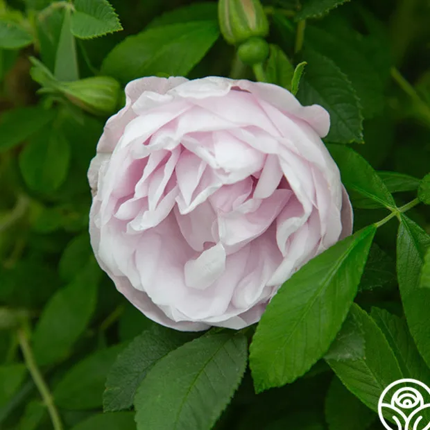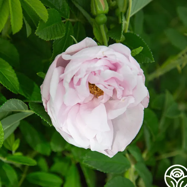 This Hybrid Rugosa is light and airy with its very strong, clove-scented flowers that bloom blush pink and fade to white. This rose is particularly effective as a small hedge and can also work well along the edge of paths or walkways. Snow Pavement has excellent vigor and disease resistance and produces rose hips later in the summer.