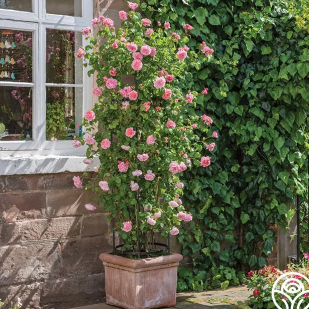 If you are looking for a very fragrant climber that does well in a pot, say hello to Strawberry Hill®! She is a tall, vigorous, healthy, repeat-blooming climber with large, glossy leaves that thrives in beds, borders, or pots. Strawberry Hill® produces pink, cup-shaped, 4 1/2″ flowers with 85+ petals that are produced in clusters. She emits a wonderfully intense myrrh fragrance, is touched with a hint of lemon fragrance, and is one of David Austin’s top recommended roses for fragrance. Be sure she faces east, west, or south for full sunlight and to be at her peak performance.