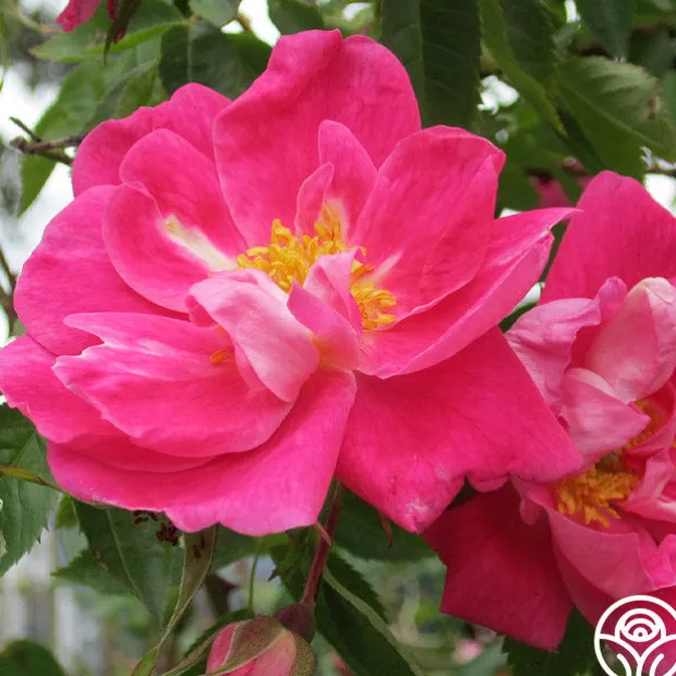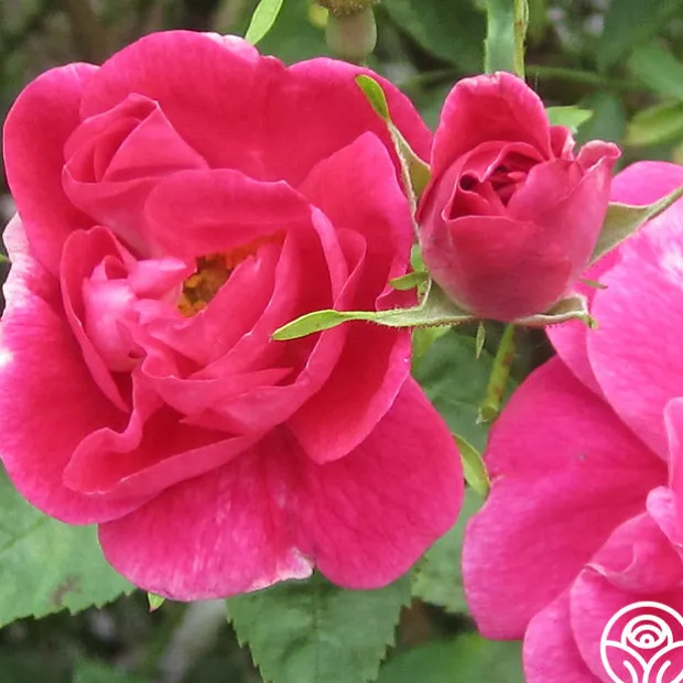 William Baffin is a vigorous, extra hardy shrub or climber. Clouds of eye-catching deep strawberry pink, semi-double blooms are touched with white toward the center that look like an artist painted a slender white line down the center of the inner petals. The entire effect is set off by his golden stamens and small red-orange hips that will appear in the winter. He blooms in large clusters throughout the season and has outstanding disease resistance. You can expect William Baffin to offer repeat blooms.